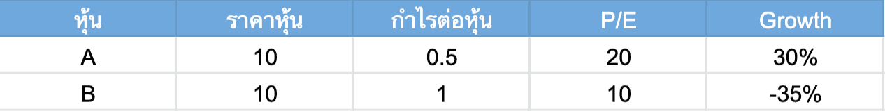 หุ้น A ราคา 10 บาท กำไร 0.5 บาท P/E เป็น 20 แต่ถ้ากำไรโตขึ้น 30% จะกลายเป็น กำไร 0.65 บาทต่อหุ้น ทำให้ P/E จะเท่ากับ 15.38